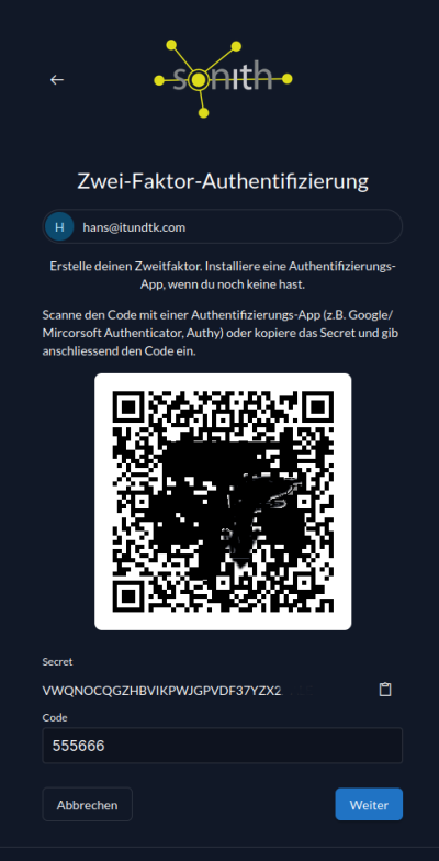 Fotografieren sie den QR Code mit der FreeOTP+ App oder der App ihrer Wahl und geben sie den daraufhin generierten Code ein.